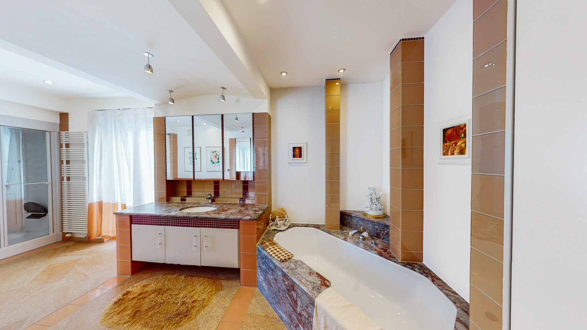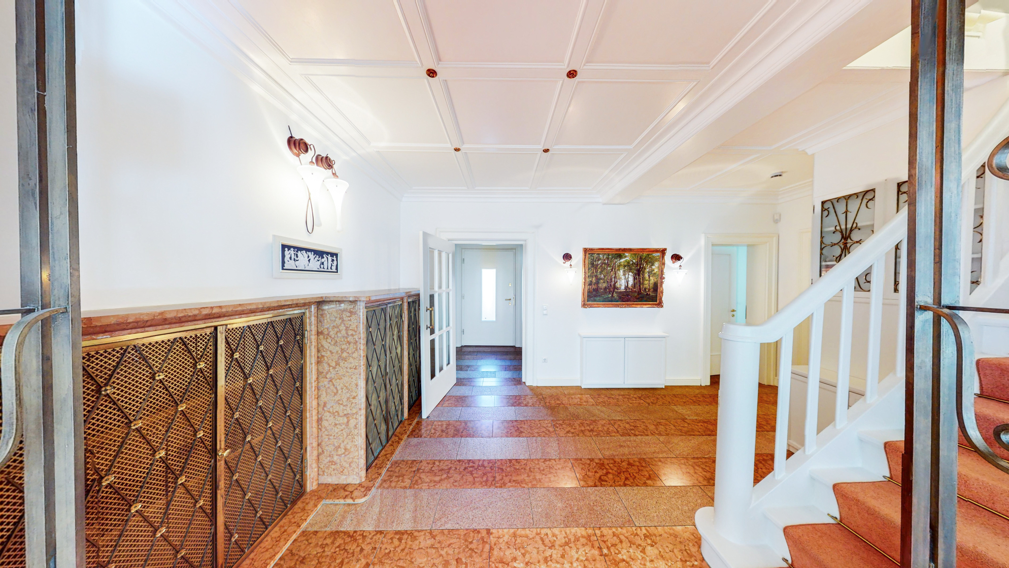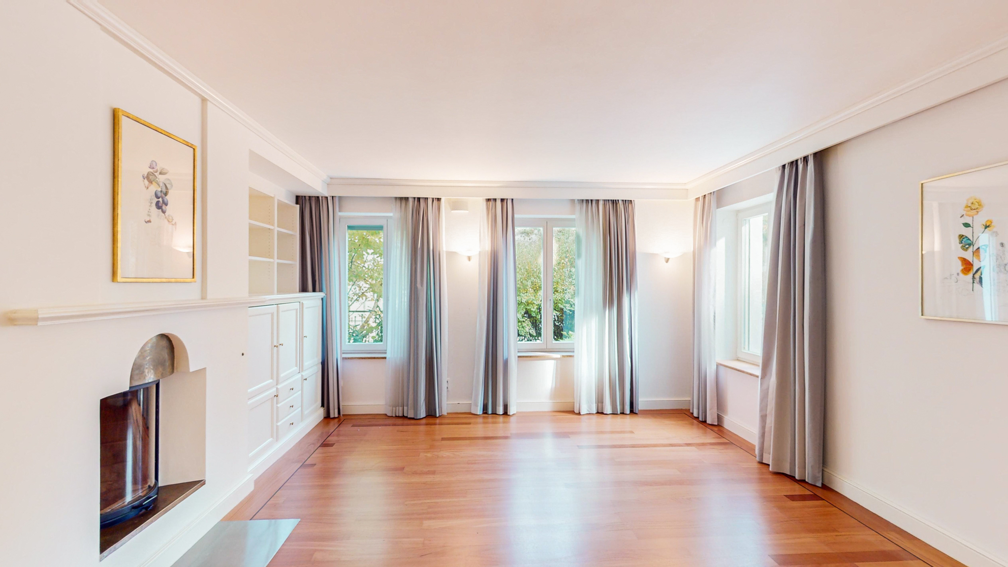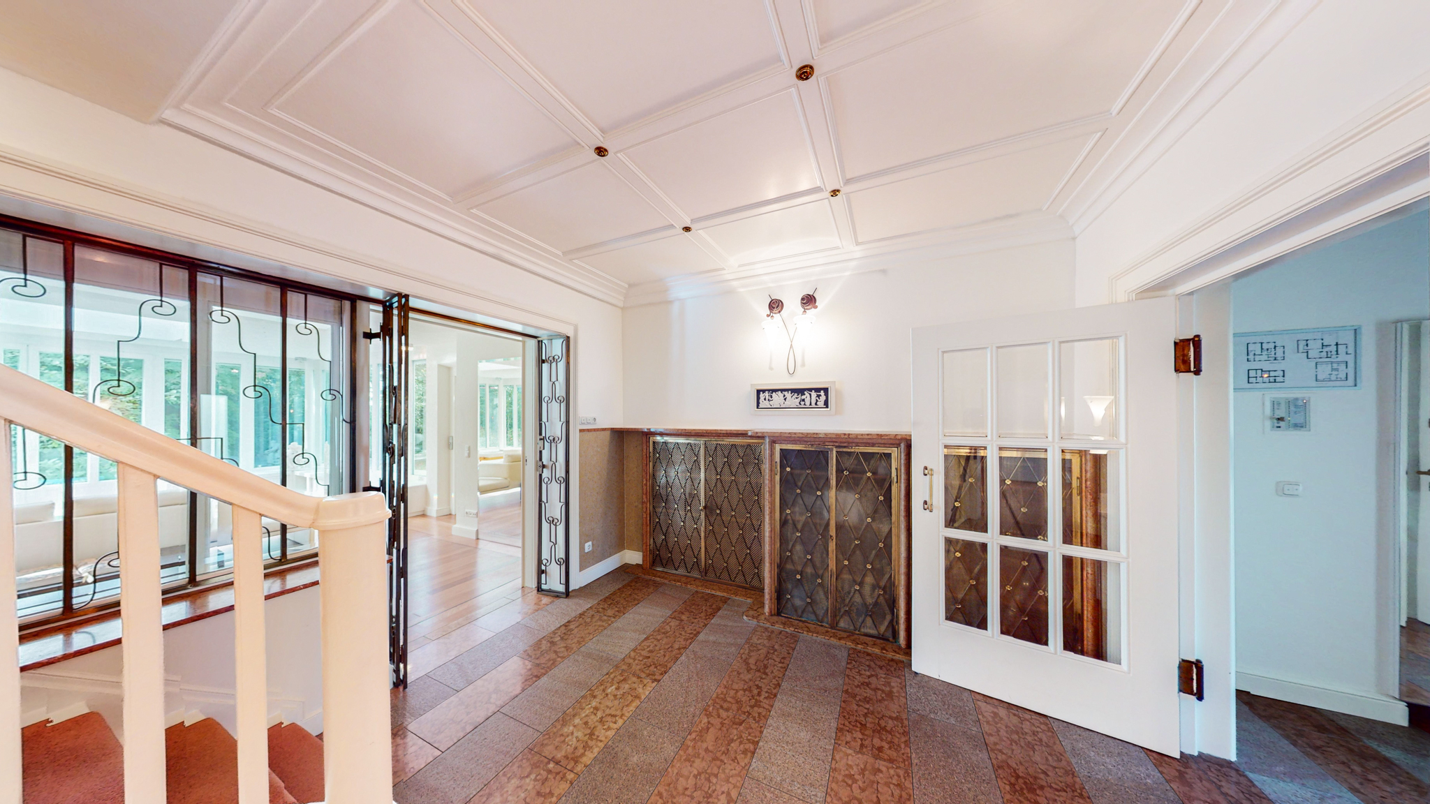 Hohe und großflächige Räume, edle Materialien und vom Innenarchitekten konzipierte Innenausbauten werden höchsten Ansprüchen an Repräsentation, Wohnen und Arbeiten mehr als gerecht. Alle Einbauten sind Schreinerarbeiten von höchster Qualität mit durchdachten Details.