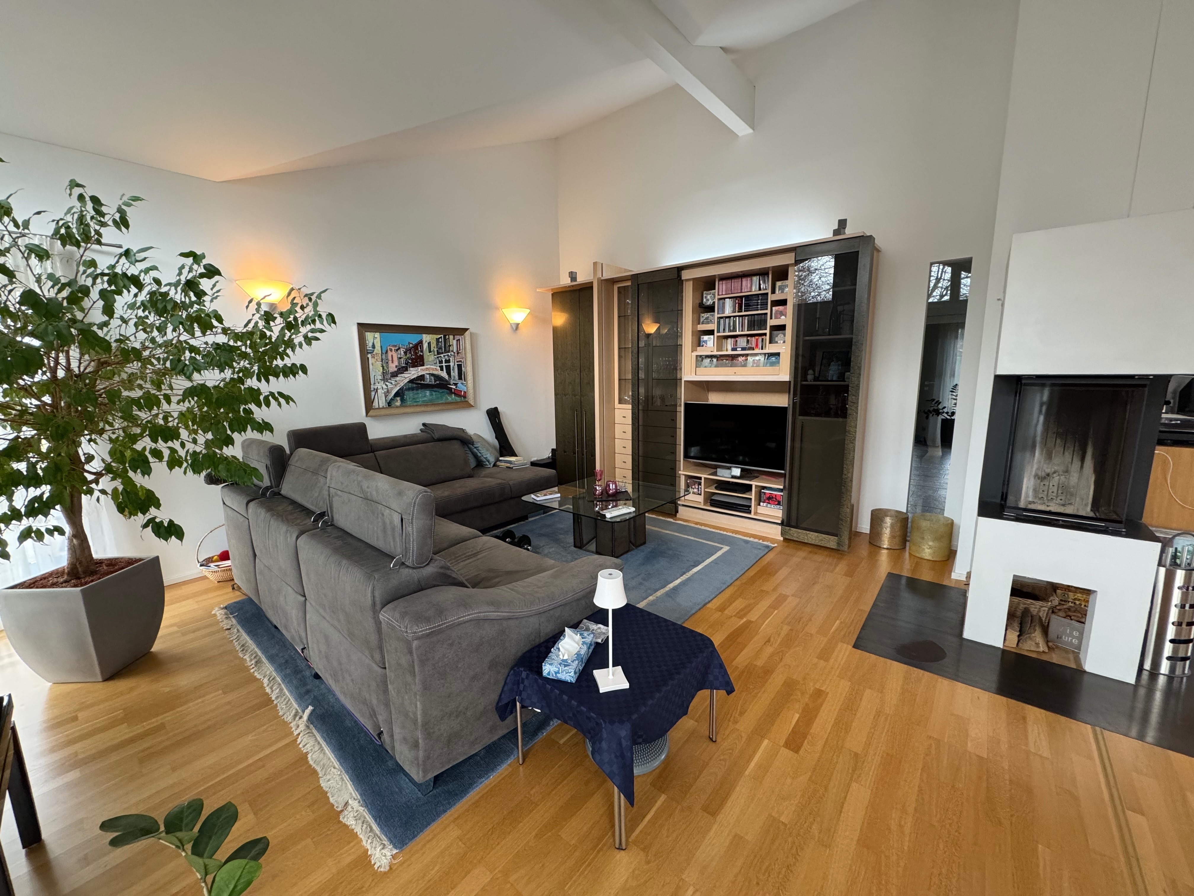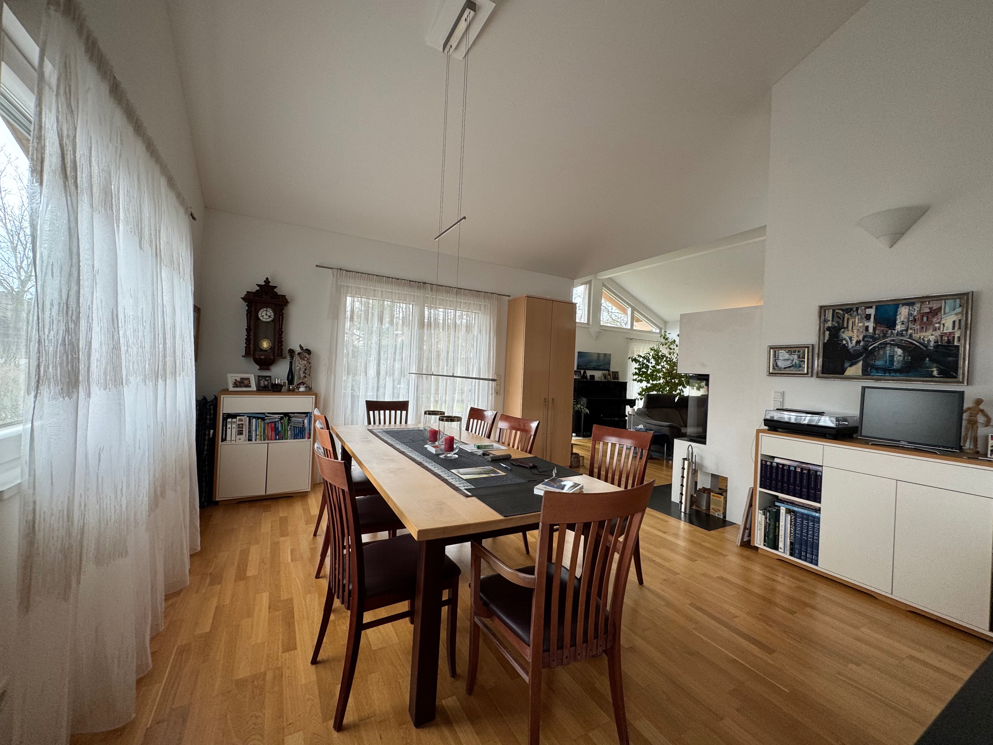 Die aussergewöhnliche Raumaufteilung, lässt im Alltag keinerlei Wünsche offen und bietet eine behagliche Wohnatmosphäre sowie flexible Einrichtungsmöglichkeiten für jeden Geschmack. Die Raumhöhe im Erdgeschoss beträgt 4,60 Meter und sorgt dadurch für einen besonderen modernen Flair. Auf ca.185 m2 Wohnfläche auf 2 Etagen, erwartet Sie im EG des Hauses ein großzügiger, heller Wohn- sowie Essbereich, mit einer traumhaften, offenen Küche mit Markengeräten von Miele, Siemens und Bosch. Zudem verfügt der Wohn – Essbereich über einen modernen Kaminofen , welcher in den Wintermonaten für ein gemütliches Ambiente sorgt. Auf dieser Ebene befindet sich des Weiteren ein moderner Eingangsbereich / Garderobe, ein Gäste WC, eine wunderschöne Bibliothek, sowie ein geräumiges Schlafzimmer mit angrenzender Ankleide, welche mit hochwertigen Einbauten versehen ist. Neben dem Schlafbereich befindet sich eine großzügige, individuell angefertigte Sauna, sowie ein geräumiges Tageslicht -Badezimmer mit Badewanne, begehbarer Regendusche, WC, Bidet und zwei Waschbecken, sowie edlen Einbauten.