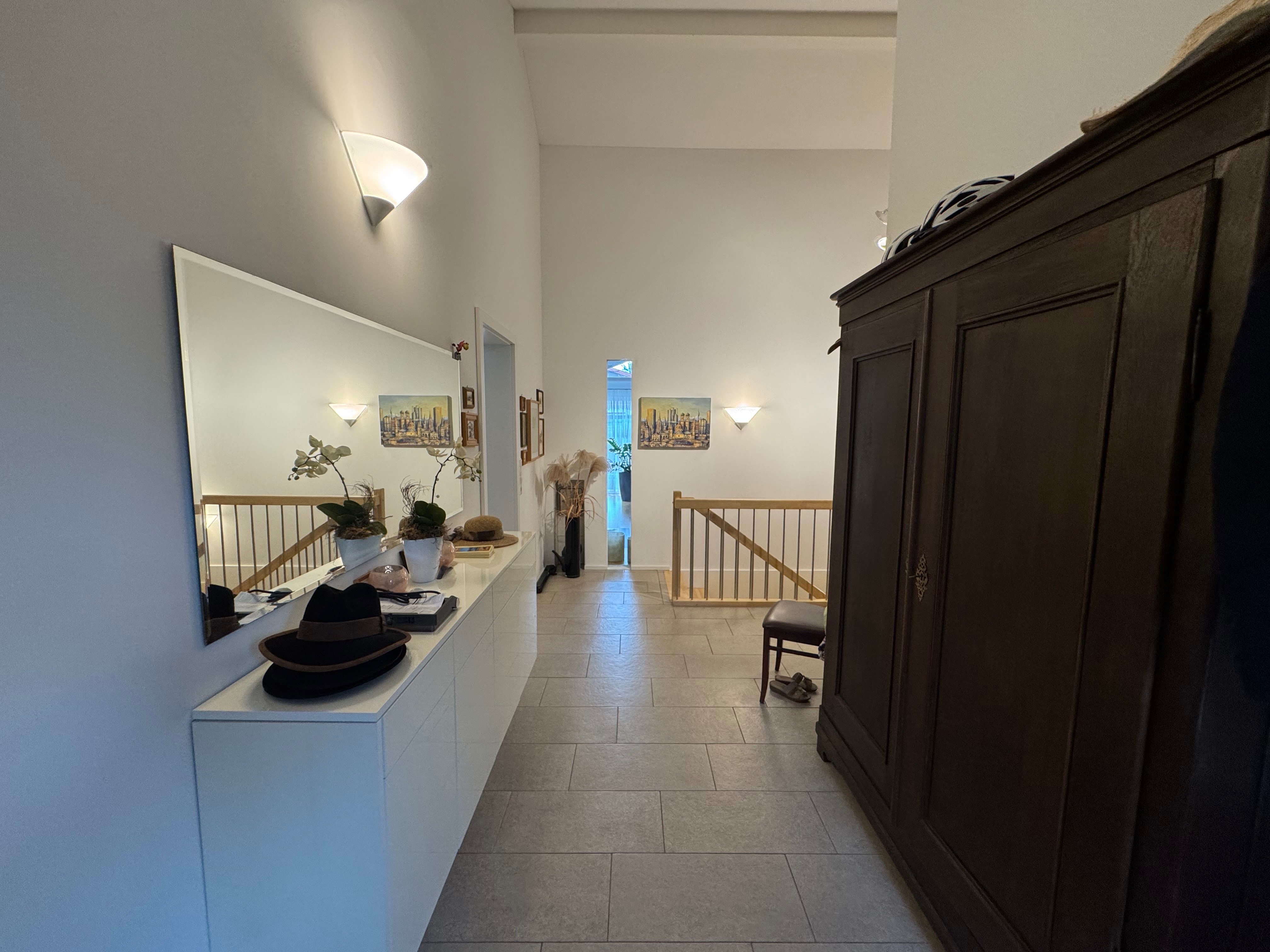 Über eine moderne Holztreppe erreichen Sie das Untergeschoss des Hauses. Hier befinden sich zwei große und taghelle Zimmer mit Fussbodenheizung (Raumhöhe 2,50 m), ein Sport – und Fitnessraum, ein Weinkeller, ein geräumiges Badezimmer, Technikraum, Waschkeller, sowie ein klassischer Abstellraum.