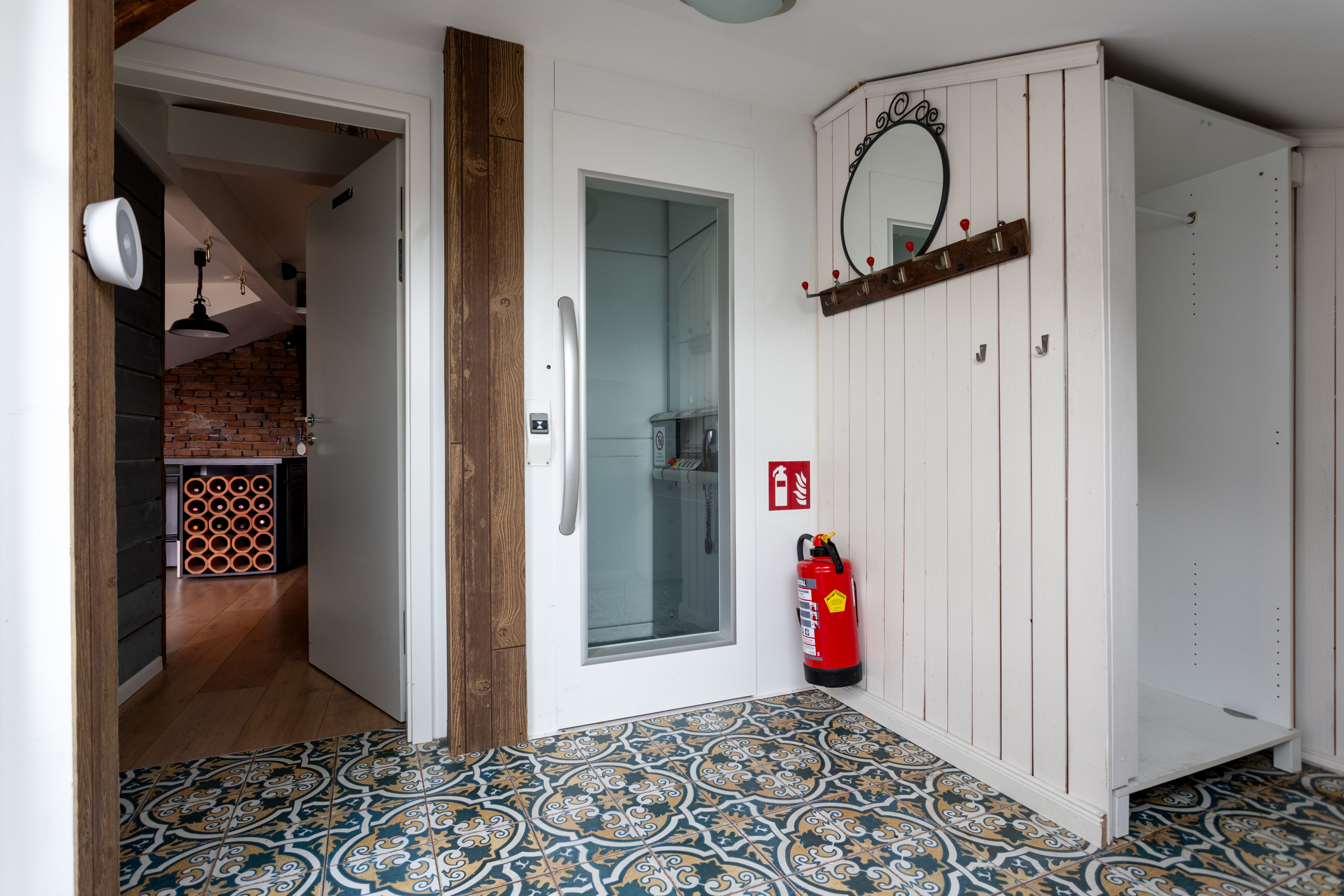 – privater Aufzug der einen Zugang barrierefrei bis ins Dachgeschoss ermöglicht. Ein kleiner Rollstuhl hat im Aufzug platz.