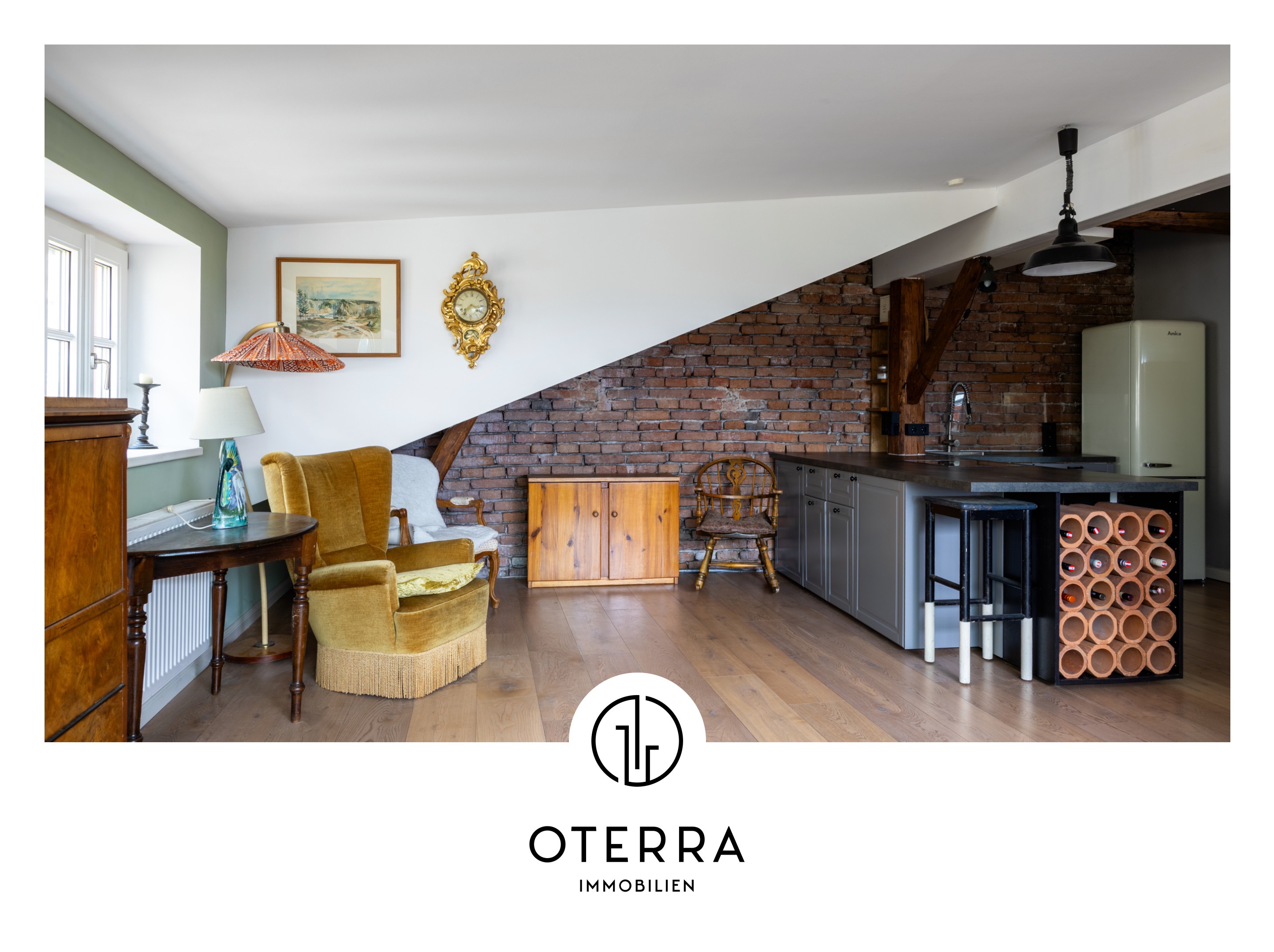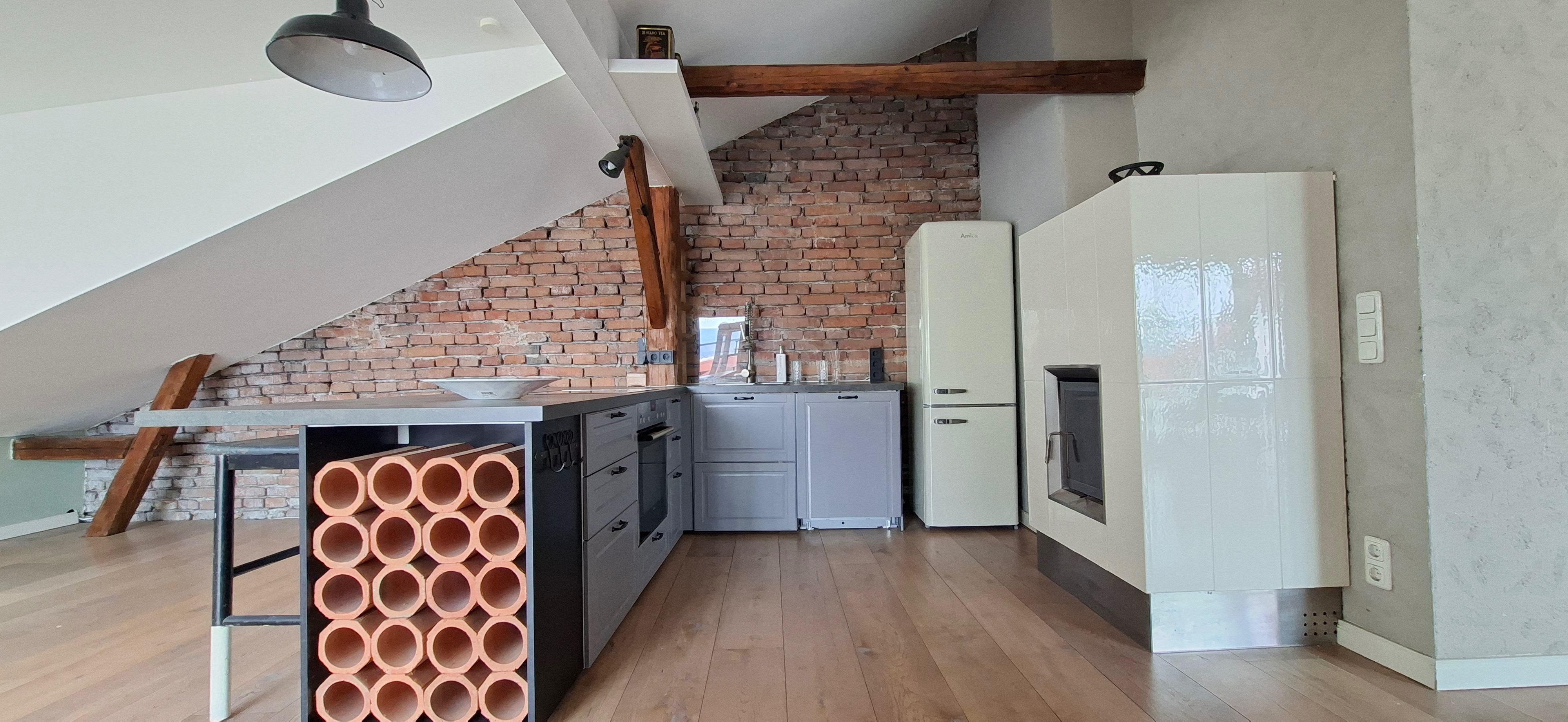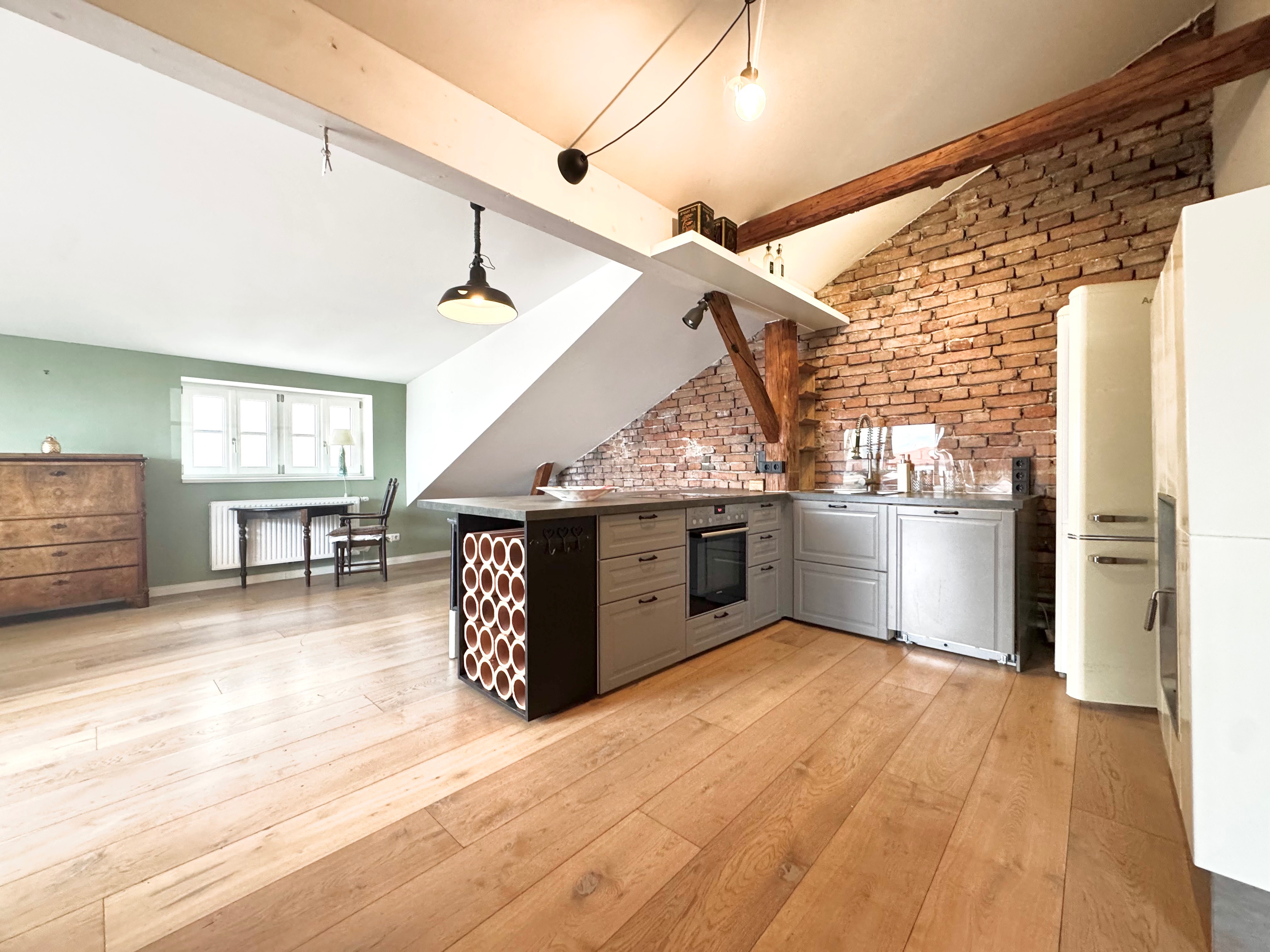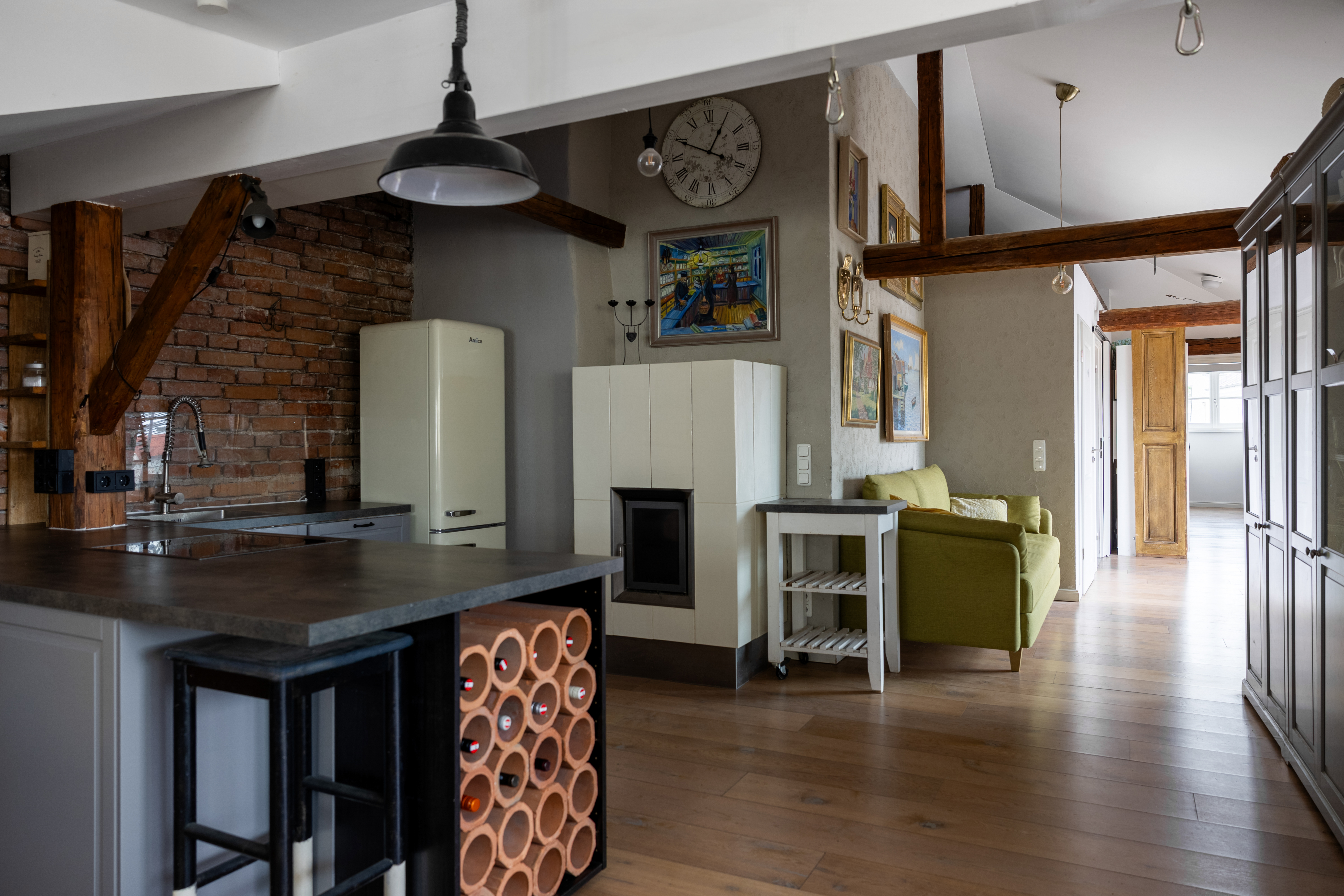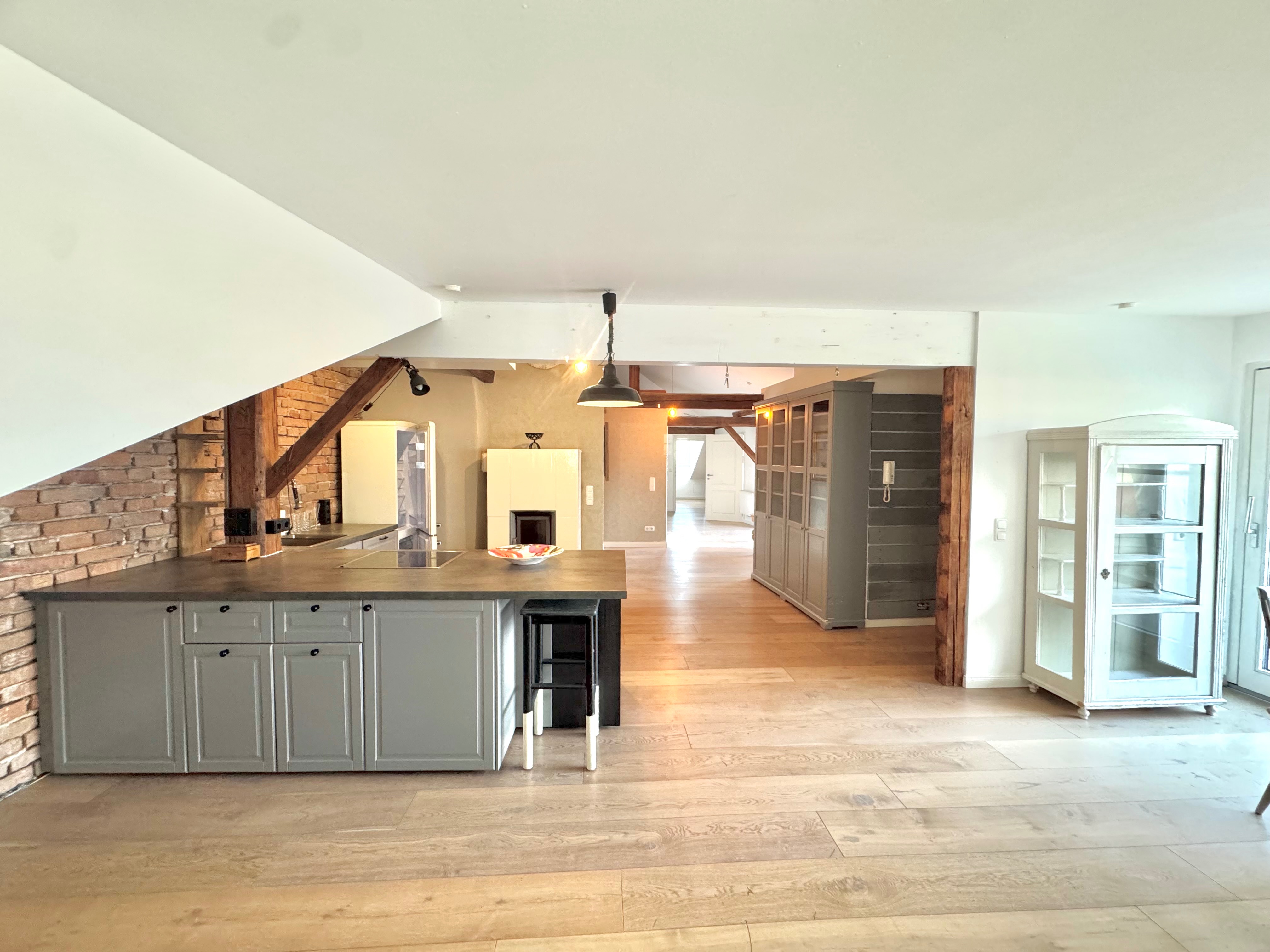 Die Sichtholzbalken, sowie die teils freigelegten Ziegelwände, gepaart mit dem modernen Innenausbau, sorgen zudem für einen ganz besonderen Flair. Hier trifft Altbaucharme auf Moderne und Eleganz! Zudem wurde der Wohn – , Kochbereich mit einem Kaminofen ausgestattet, welcher in den Wintermonaten für eine gemütliche Wohnatmosphäre sorgt.