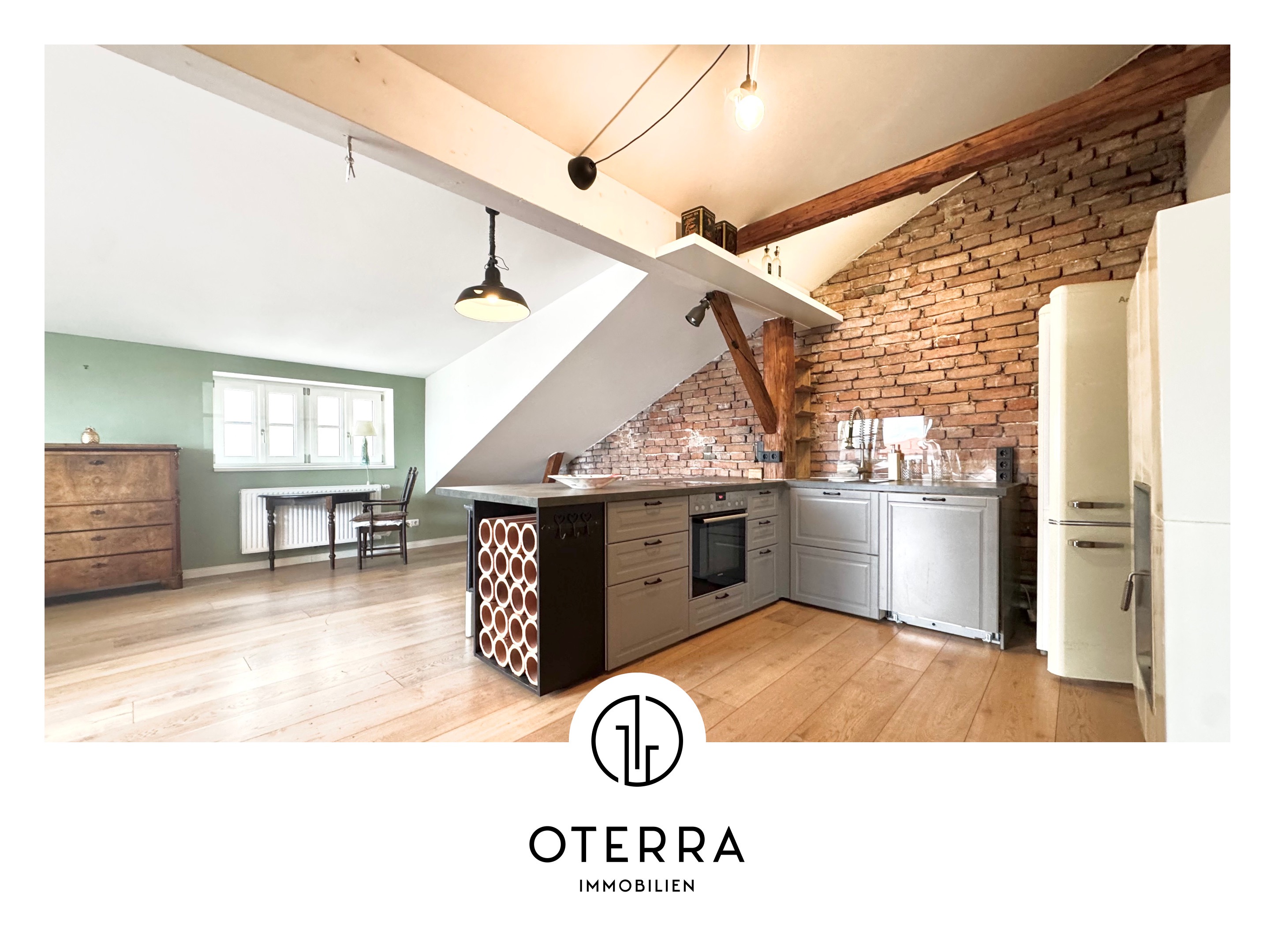 – Sichtholzbalken und freigelegte Ziegelwände