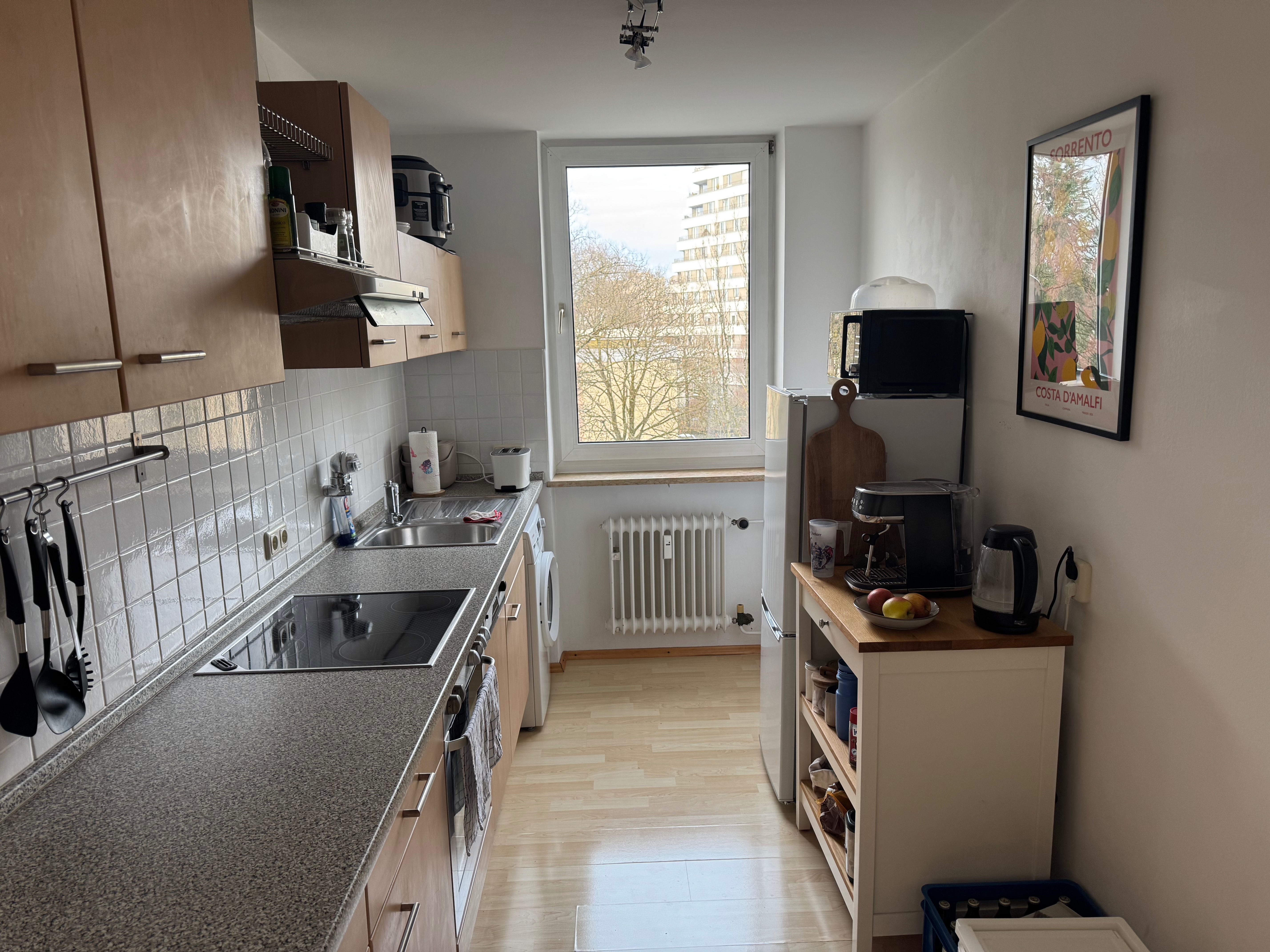 Die Wohnung ist mit einer Einbauküche ausgestattet, in die auch eine Waschmaschine integriert ist.