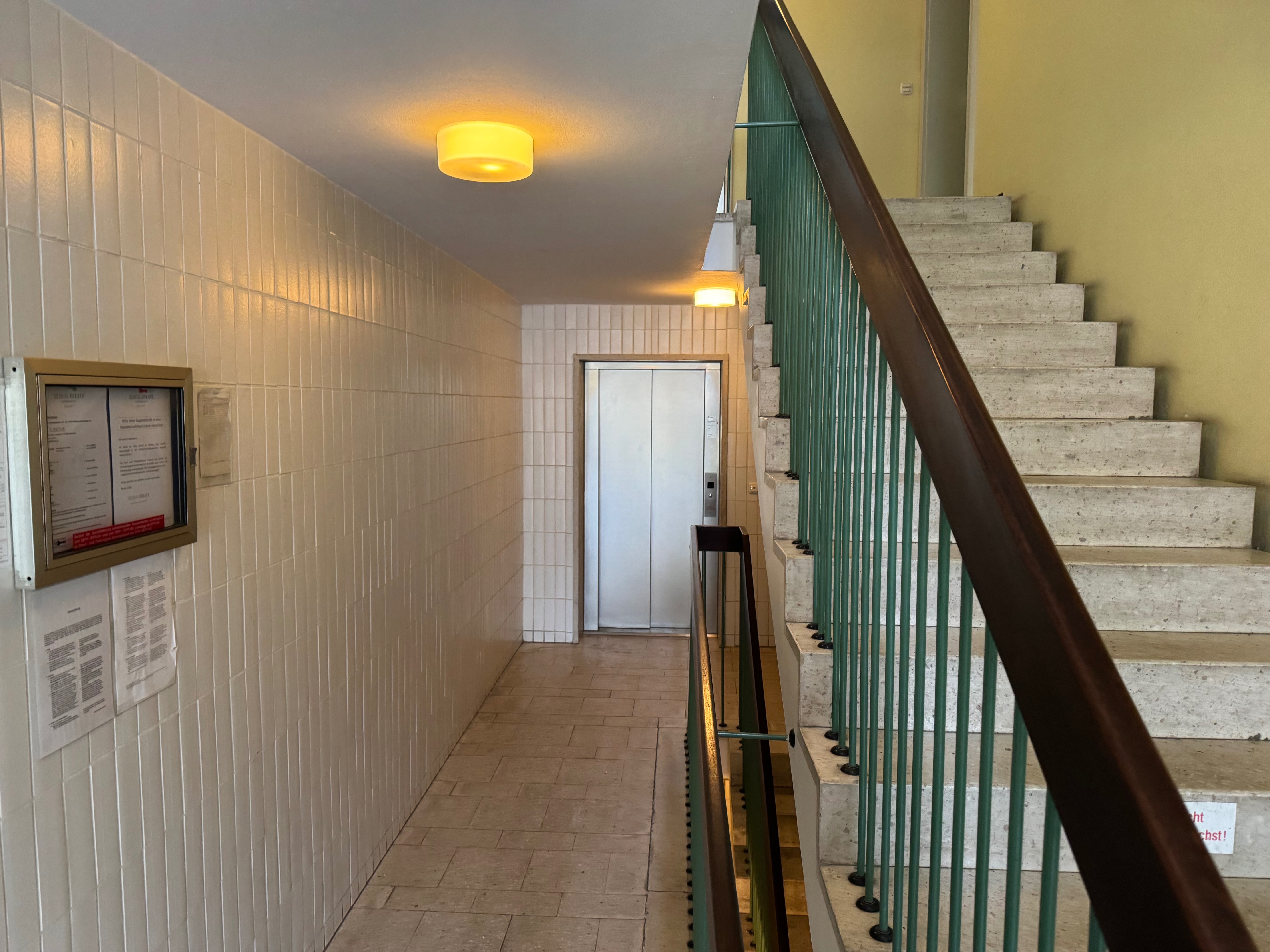 Während der Flur-/Eingangsbereich mit Fliesen ausgelegt ist, sind in den Wohnräumen Parkett sowie in der Küche Laminat verlegt.