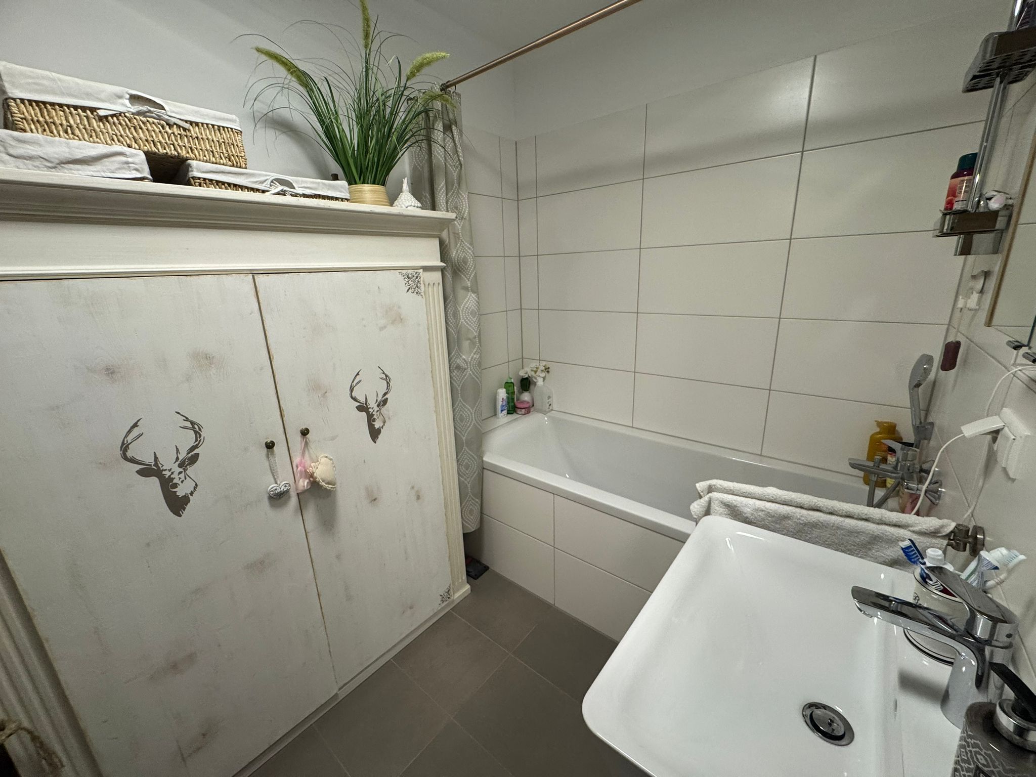 Das Raumangebot umfasst ein großzügiges Elternschlafzimmer, ein helles Kinderzimmer sowie eine repräsentative Diele mit zusätzlicher Abstellfläche und integriertem Einbauschrank. Das stilvoll gestaltete Badezimmer überzeugt mit hochwertiger Ausstattung, Badewanne und WC.