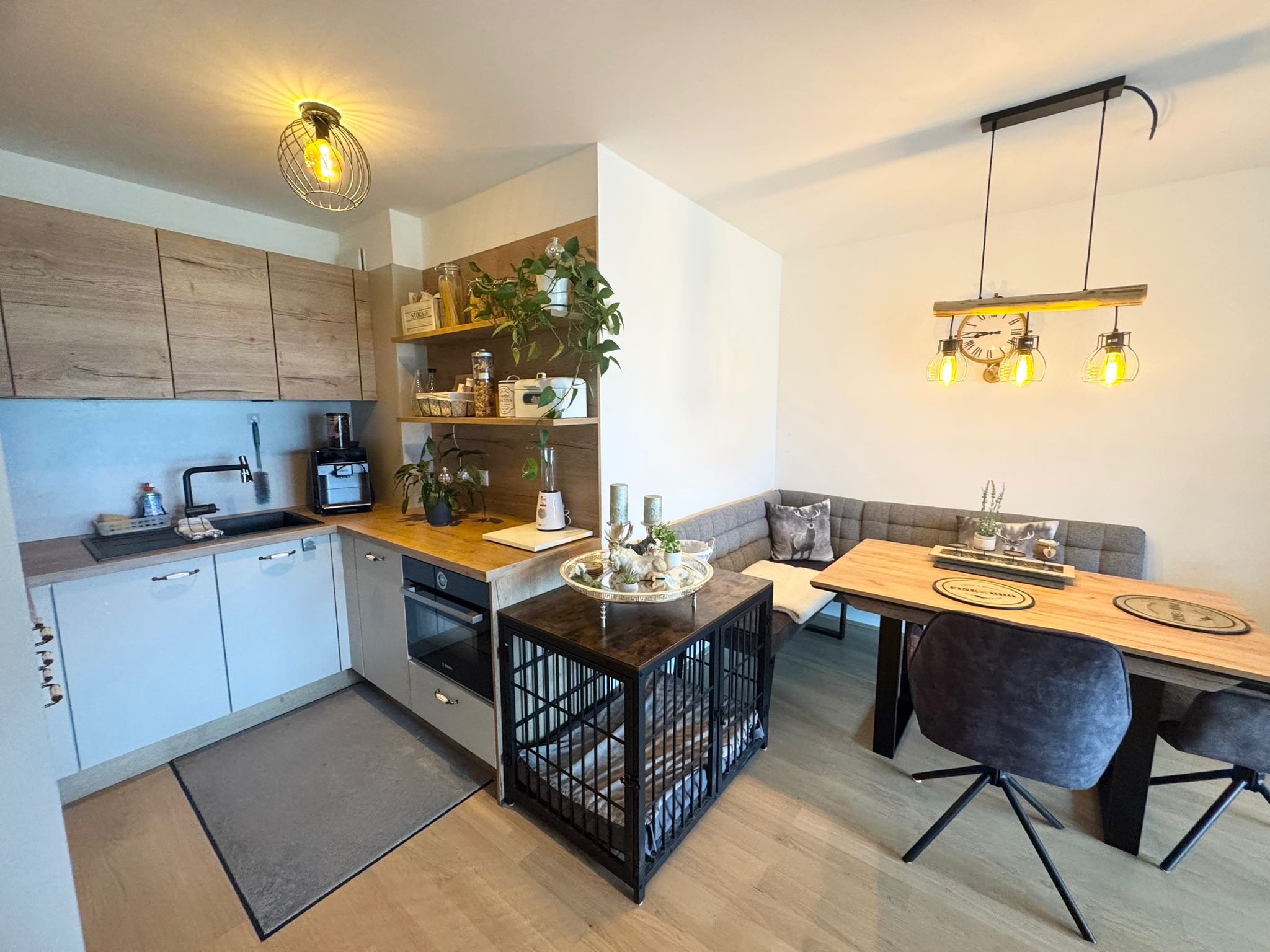 Der großzügig gestaltete Wohn-, Ess- und Küchenbereich bildet das Herzstück der Wohnung. Die offene Raumgestaltung schafft ein elegantes und zugleich einladendes Wohngefühl. Die hochwertige Einbauküche fügt sich harmonisch in das stilvolle Gesamtbild ein und unterstreicht den exklusiven Charakter der Immobilie.