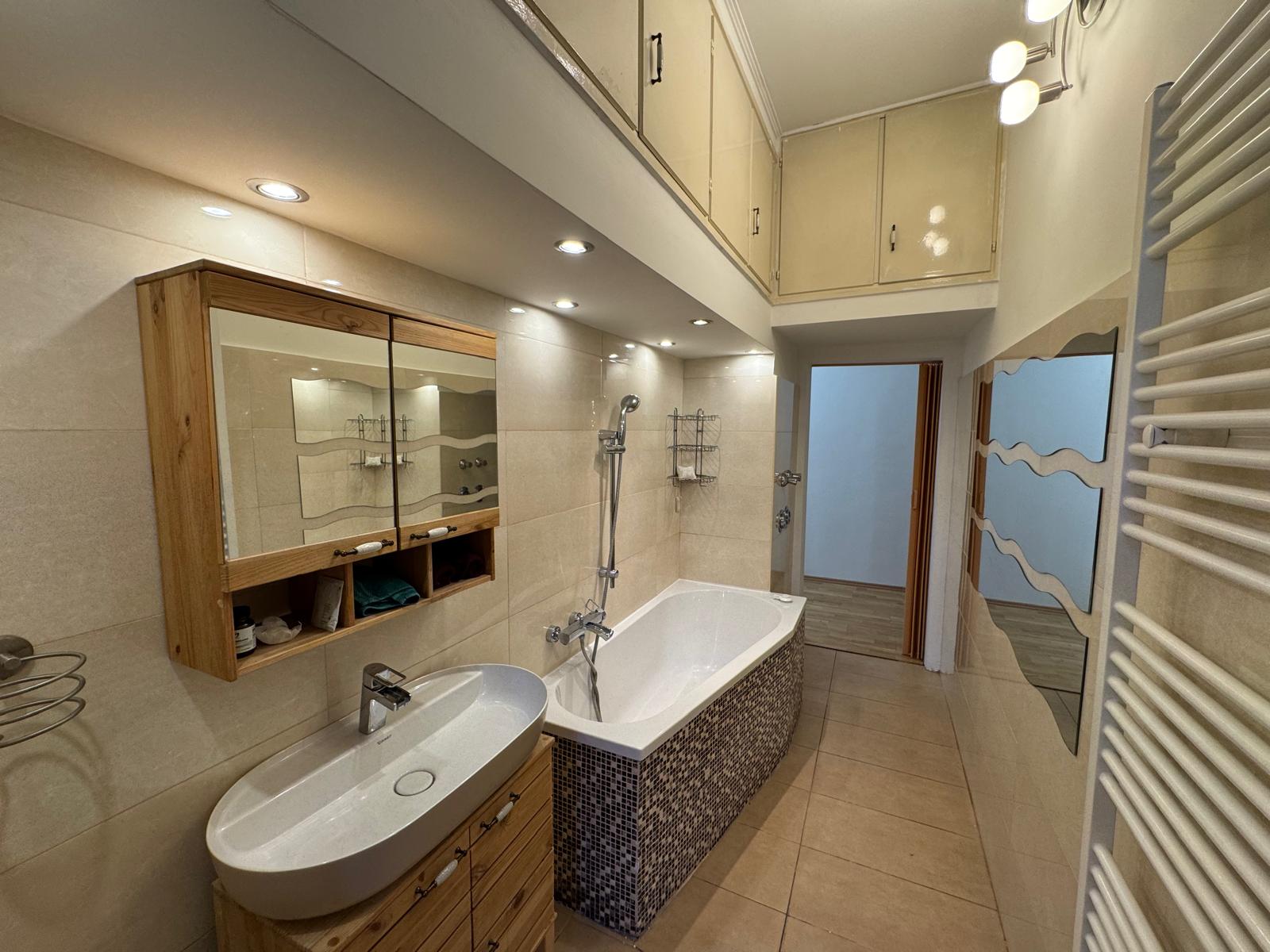 Von der Diele aus gelangen Sie in das modern ausgestattete Badezimmer mit Badewanne, Waschbecken, WC und Tageslichtfenster. Durchdachte Stauraumlösungen sorgen hier für zusätzlichen Komfort. Ebenfalls von der Diele zugänglich ist die großzügige, geschmackvoll möblierte Wohnküche, die mit ihrem einladenden Ambiente zum Kochen und geselligen Beisammensein einlädt.