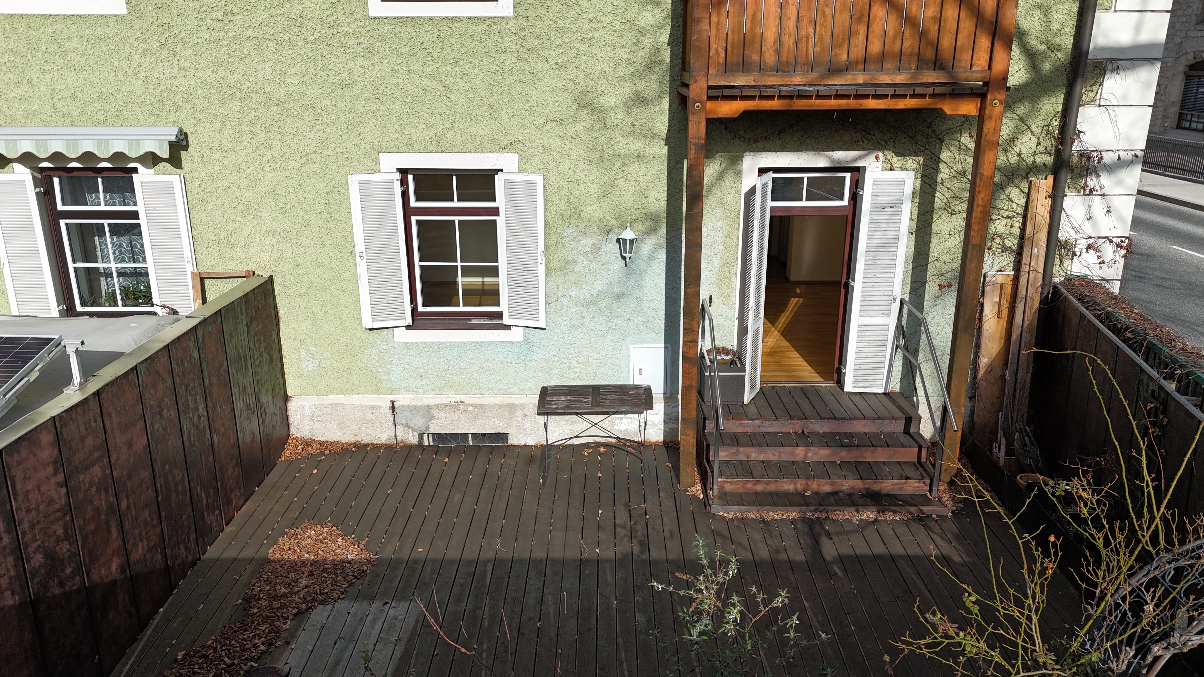 Das Herzstück der Wohnung bildet das großzügige, lichtdurchflutete Wohnzimmer. Von hier aus gelangen Sie direkt in den Garten- und Terrassenbereich. Die ca. 60 m² große Terrasse aus hochwertigem Lärchenholz, eingefasst von einem stilvollen Sichtschutzzaun aus edler Eiche, bietet ein außergewöhnliches Outdoor-Wohnerlebnis mit herrlichem Bergblick auf den Predigtstuhl – ideal für gemütliche Stunden im Freien.